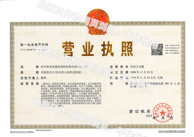 四川省安國建筑消防檢測有限責任公司 地址:成都市武陽大道一段288號中央花園城市別墅一期1棟28號
